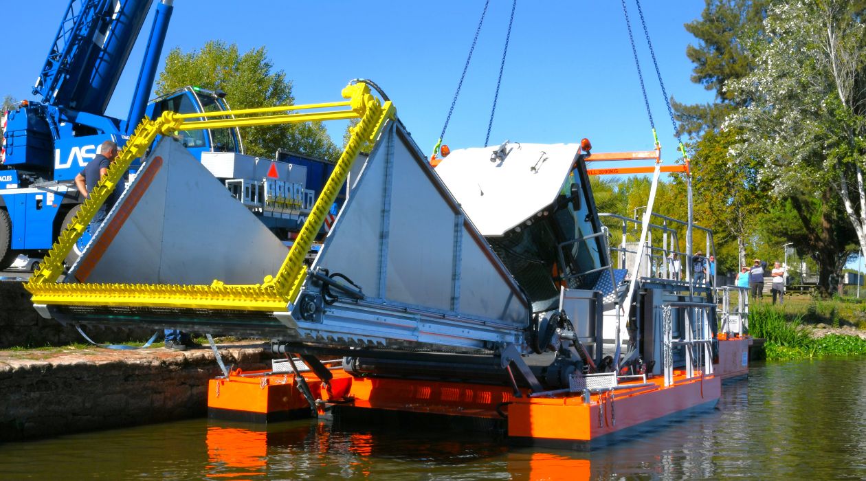 Com 16,65 metros de comprimento, 4,75 metros de largura e uma capacidade de carga de 6.500 kg de biomassa (cerca de 18 m³), a Conver MC106 combina sistemas de corte, recolha e descarga automática, permitindo maior rapidez, eficiência e sustentabilidade na remoção das plantas invasoras.